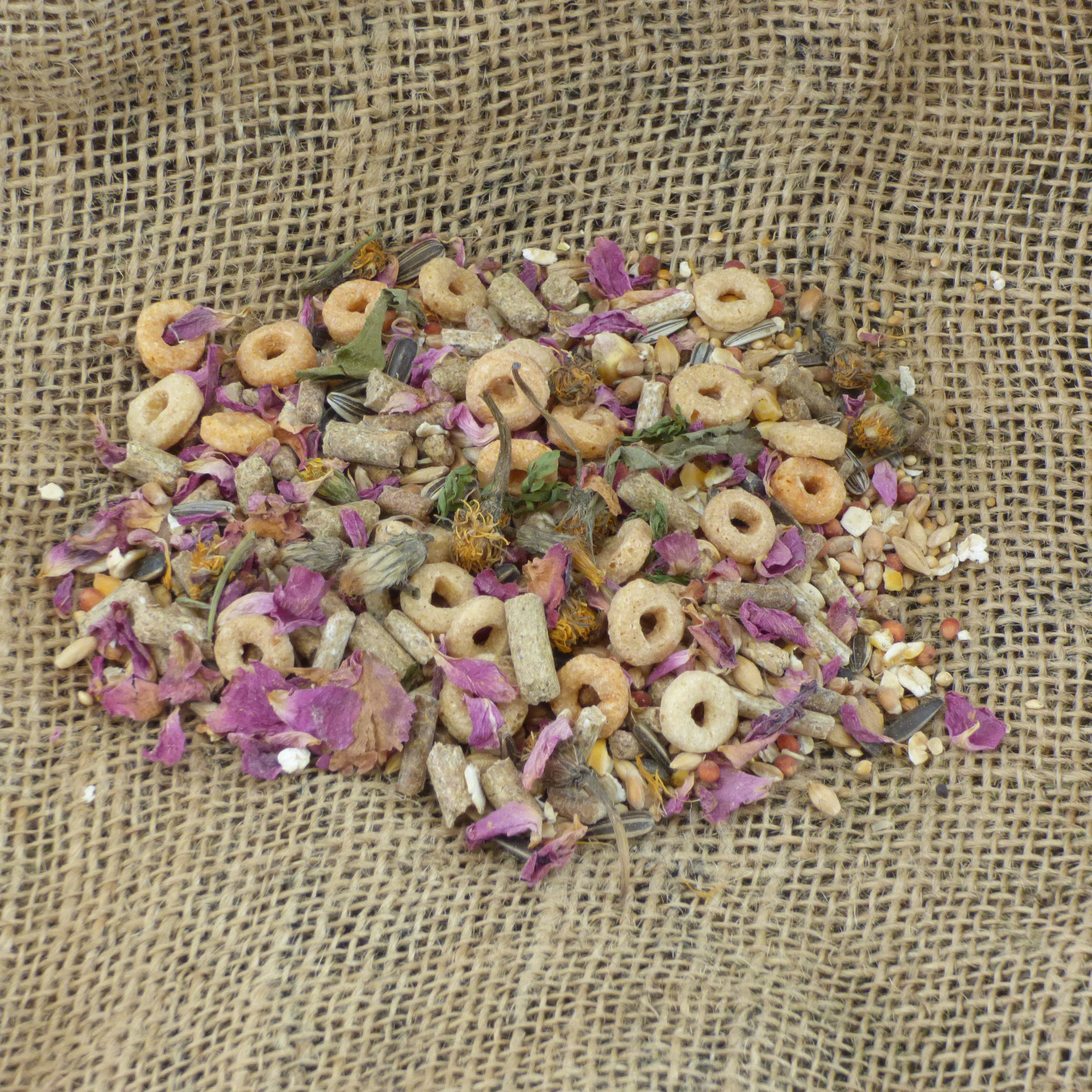 Includes rose petals, mixed grains, dried fruit, organic maize, ryegrasses, wheat, medicinal dandelion and rolled oats.